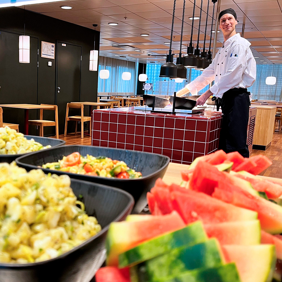 Lounasbuffet sisältää pääruoat lisukkeineen, monipuolisen ja runsaan salaatin, leivän, herkullisen jälkiruuan ja kahvin tai teen.