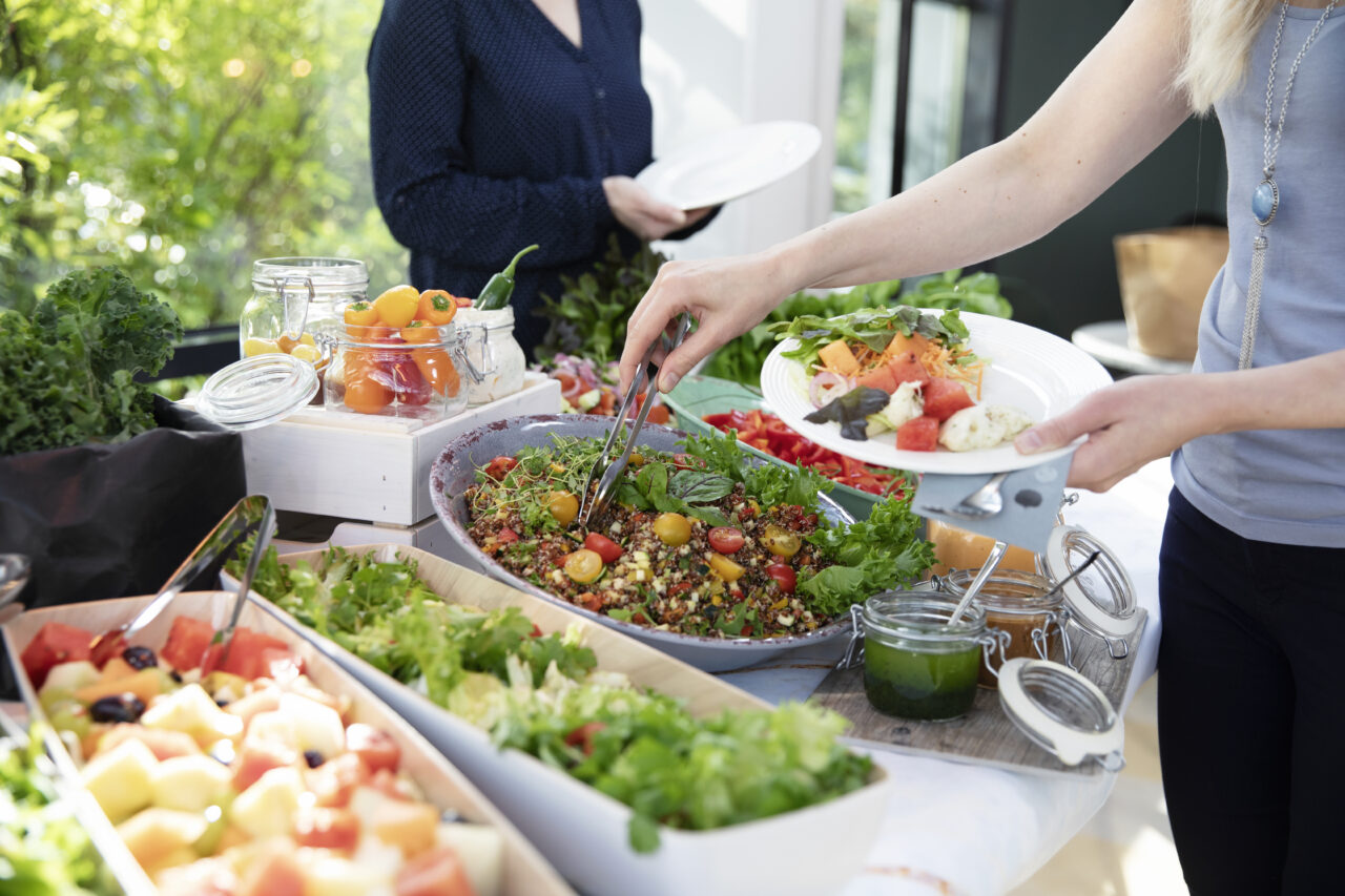 Lounasbuffet sisältää pääruoat lisukkeineen, monipuolisen ja runsaan salaatin, leivän, herkullisen jälkiruuan ja kahvin tai teen