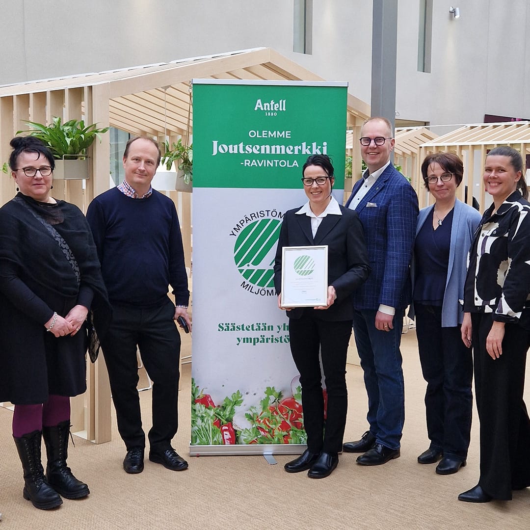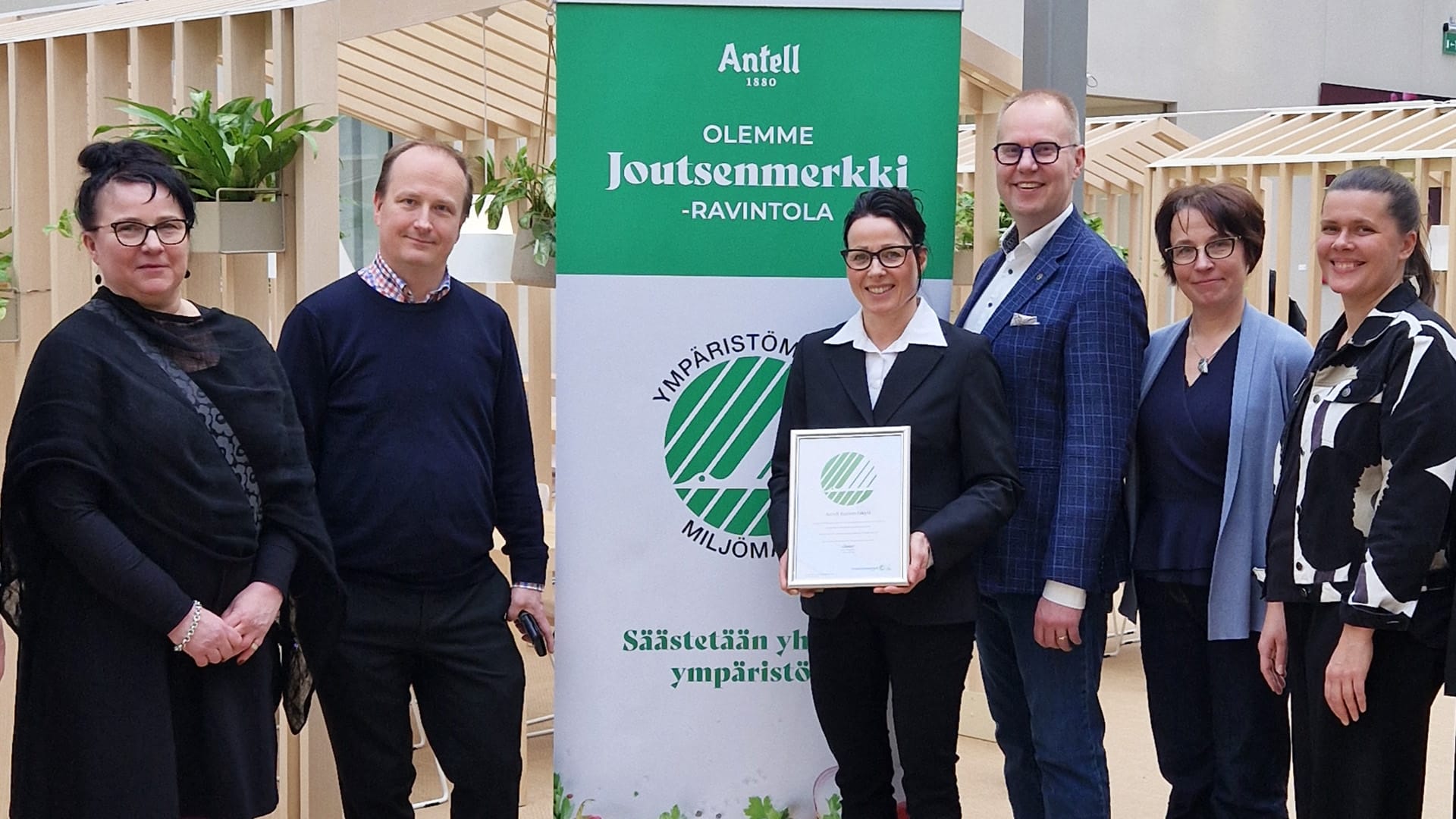 Kuvassa OP:n Anne Koskela (vas.) ja Kimmo Patrikainen, Antellin Pauliina Martikainen, Tomi Lantto ja Päivi Hjelm sekä Ympäristömerkintä Suomen Malin Lindfors.